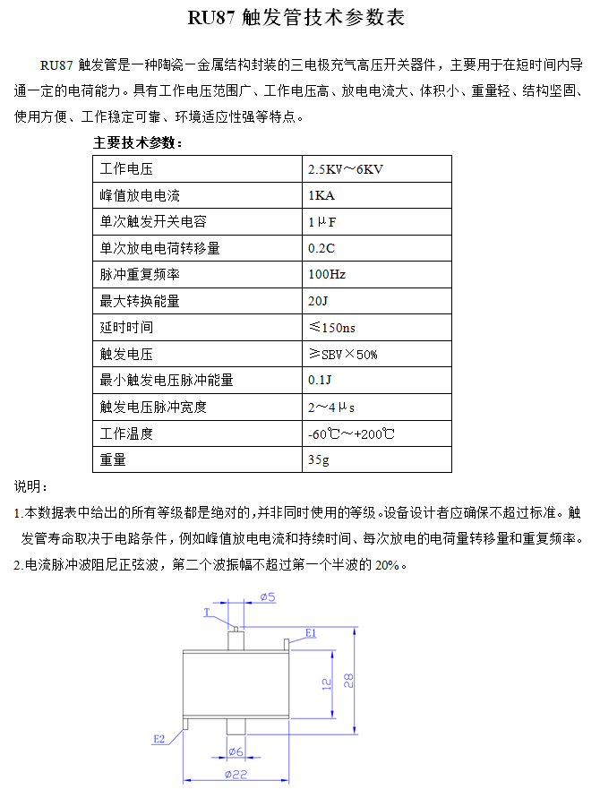 RU87觸發(fā)管技術參數(shù)表